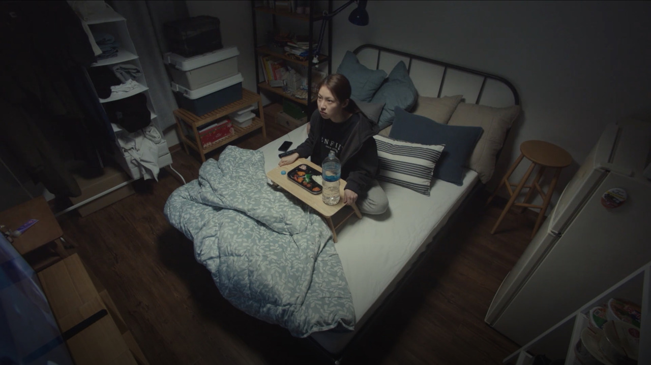 2. 진아의 세계는 불안정하지만 그 자체로의 질서와 리듬을 가지고 있다. 진아의 세계에서 타자의 빈자리는 스마트폰과 TV가 대신 자리한다. 호혜적 관계에 대한 일방적 관계의 대체. 타자에 대한 자아의 방어수단. 왜 진아만이 유령을 마주하는가? 왜 다른 인물들은 그 자리에 있는 남자의 유령을 발견하지 못하는가? 우리는 영화에서 유령이 처음으로 등장하는 순간이 진아가 처음 휴대폰에서 눈을 떼고 타자와 소통하는 순간이라는 것을 알아야 한다. 첫 장면에서부터 진아는 항상 휴대폰과 함께한다. 타자의 자리를 대체하는 매체. 그런 진아를 처음 소통하도록 만드는 타자가 유령이다. 남자의 유령은 진아에게 서운하다는 듯이 말한다. “인사 정도는 해주지”. 인사라는 애도. 인사라는 환대. 환대받기 위해 돌아온 유령. 이 환대를 할 수 있는 사람은 유령과 같은 자리에 있는 진아뿐이다. 그때부터 진아의 세계는 흔들리기 시작한다. 식사를 하던 진아의 방에 잠깐의 흔들림을 일으킨다. 일상의 균열. 흔들리는 질서. 이때 진아의 세계에 균열을 가하는 또 다른 힘이 있다. 어머니의 이름으로 가장한 아버지의 전화이다. <혼자 사는 사람들>에서 기성세대는 관계를 도구화해서 맺는다. 법으로서 가족을 도구화하는 진아의 아버지. 세입자인 남자의 죽음을 오로지 집값의 문제로만 바라보는 집주인. 상담원에게 폭언을 쏟아내는 무개념 고객 등. 물론 이러한 세대론적인 접근이 지나치게 도식적이면서 이분법적으로 영화에서 묘사되는 것은 위험해 보이는 것 또한 사실이다.