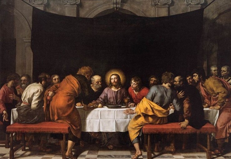 다빈치의 그림은 1495년인데 이 그림은 1618년입니다. 150년 지났는데 세련되고 종교적 색채를 떠나고 있지만 원후광이 있죠. 다빈치는 후광이 없고 가장 큰 창문으로 후광을 줍니다. 관념적인 후광이 아니죠. 가롯 유다 뒤에만 후광이 없고 배경이 사람이죠. 보통 그림이 아니죠. 150년 전 뒤에 그려진 그림보다도 오히려 더 훨씬 더 뛰어난 작품성을 가지고 있다.