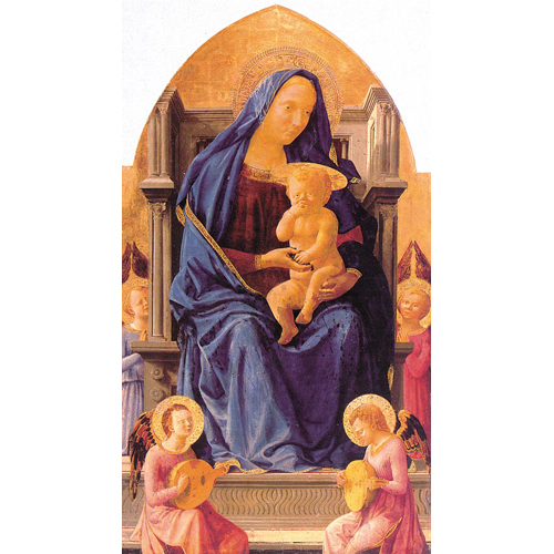 배경 앞에 마리아가 있고 그 앞에 예수가 있고 그 앞에 천사들이 있습니다.