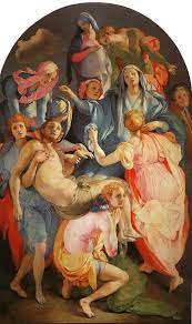 바로크 직전의 그림입니다. 르네상스 미술은 이탈리아죠. 그런데 이 그림은 다릅니다. 르네상스는 그리스를 복원하는 거죠. 조화와균형미… 그런데 이 그림에서 예수는 균형미가 없죠. 예수를 받치고 있는 이 여자의 표정도 이상하고 옷은 왜 벗고 있죠?
