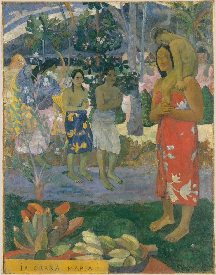 예수와 마리아가 보입니다. 마리아게 경배를 표현하고 있는데 그림을 보고 제목을 맞출 수가 없습니다. 고갱이 마리아라고 생각한 순간 마리아입니다. 고갱은 타이티 섬에서 예수의 순고한 사랑과 마리아의 헌신을 느꼈습니다. 그렇게 원색적이고 강렬하고 순박한 그 사람들의 모습에 반해서 그걸 그대로 표현한 겁니다.