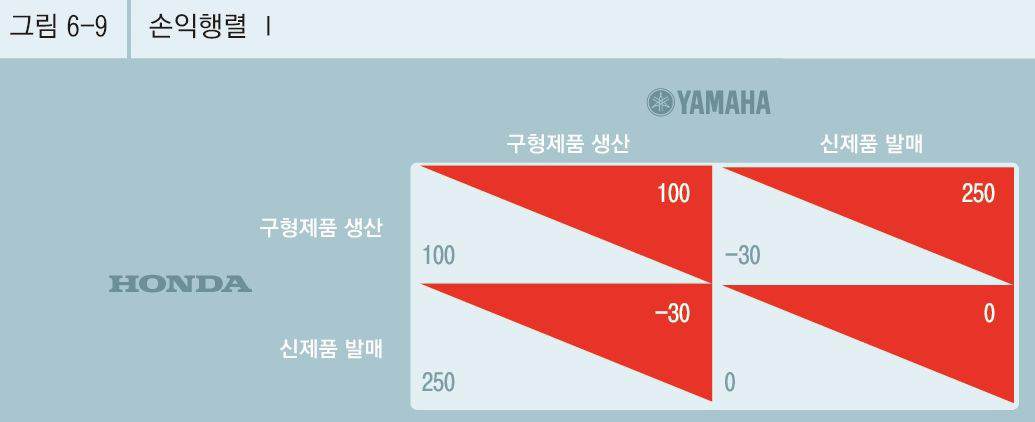 그림 6-9에서 만일 두 기업이 모두 신제품을 출시하지 않으면 양쪽 기업 모두 100의 이익을 얻지만 야마하가 신제품을 발표하고 혼다가 신제품을 발매하지 않을 경우 야마하의 이익은 250이 되고 혼다는 30만큼의 손실을 보게 된다. 반대의 경우는 야마하가 30만큼의 손해를 보고 혼다는 250의 이익을 보게 된다. 그리고 두 기업이 모두 신제품을 출시할 경우 모두 영의 이익을 얻게 된다.